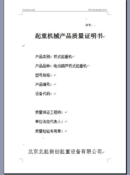 起重機(jī)產(chǎn)品質(zhì)量證明書